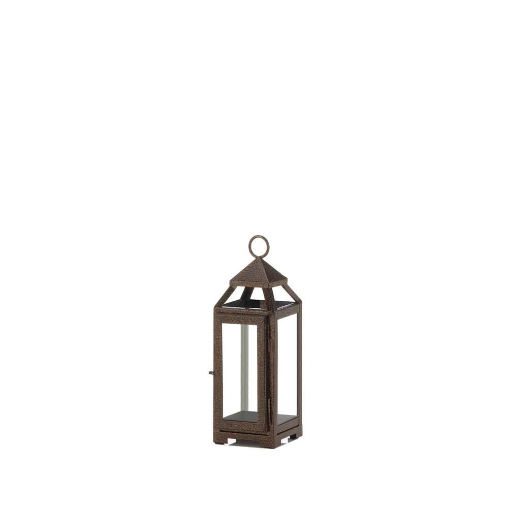 Charming and chic, this mini copper lantern will add a rustic look to your indoor or outdoor decor. The decorative lantern features an iron frame in a speckled copper finish, encased with glass window panes. Place a pillar candle inside the small lantern to illuminate any space in a soft and subtle glow. Weight 1.2 pounds. 3.5" x 4" x 11". Iron, Glass. UPC Number: 849179038021.